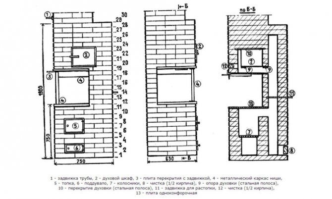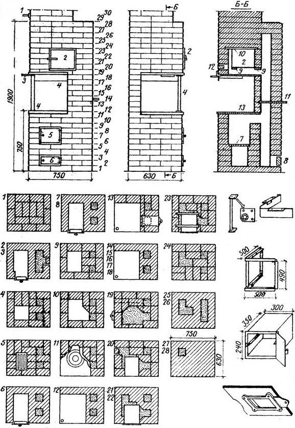 Soba yaz mutfağı için uygundur; yakıt, soba-1'deki büyük bir delikten yüklenir, burada kupalar eski bir tencereden bir kapakla değiştirilebilir. Böyle bir sobayı sadece odunla ısıtabilirsiniz. Fırın, kapısız bir üfleme deliğine sahiptir-2. Daha iyi yanma için, dördüncü sıraya monte edilmiş ateş kutusunda bütün tuğlalardan-3 yapılmış ızgara çubukları vardır. Fırından çıkan gazlar geçiş duvarı-4'ten geçer, aşağı iner, fırın duvarlarını ısıtır ve yükseltici boruya yükselir. Kenarına tuğla ile örülmüş kurum temizleme penceresi-5 bulunmaktadır. Sahipler için uygun olan yere ev yapımı bir sac metal-6 valf monte edilebilir. 27. sıranın tabanındaki vana için 0.3-0.5 cm derinliğinde bir yuva dışarı itilir.Yuva yüksekliği demir vana kalınlığına göre yapılır, böylece 0,2 cm'den fazla kalmaz. Valf ve valf üzerindeki boşluk serbestçe hareket eder. Levha 11. sıraya serilir. Soba zemine kadar ısıtılır ve minimum soba aletlerine sahiptir.