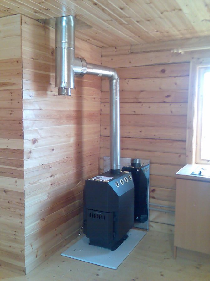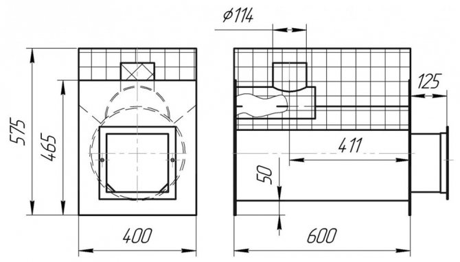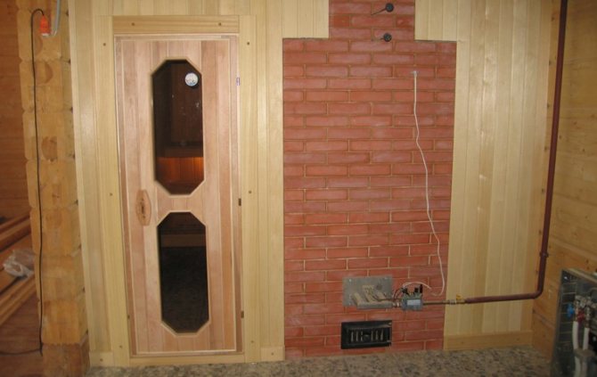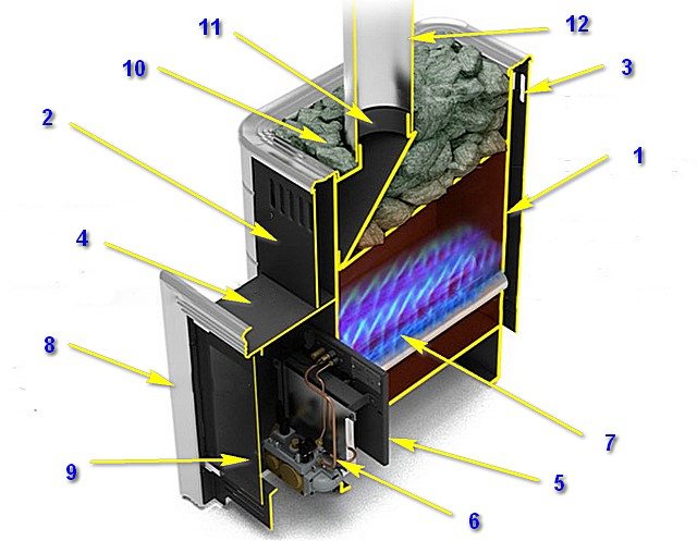 Soyunma odasına bakan tarafta, sobanın genellikle uzun bir yakıt kanalı (madde 4) vardır, bu da yükleme penceresine ve buna göre gaz ekipmanının buhar odasından duvardan çıkarılmasına izin verir.