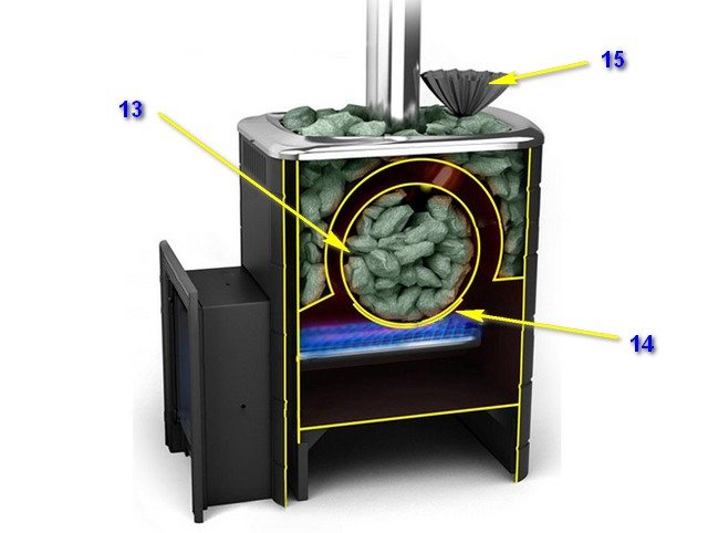 Doğal olarak, herhangi bir sauna sobası bir ısıtıcı gerektirir. Taş döşeme bölmesi, gösterilen modelde olduğu gibi (konum 10), ön veya yan duvarlar boyunca üstte yer alabilir ve hatta bazen tüm fırın gövdesini neredeyse tamamen kaplayabilir.