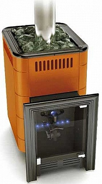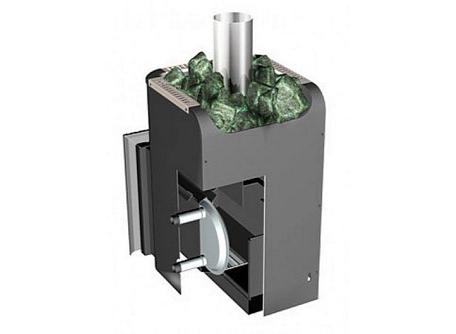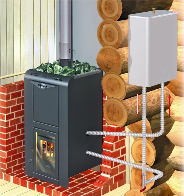 Bu aynı zamanda Ermak sauna sobalarının modifikasyonlarından biridir, ancak zaten suyu ısıtmak için içine bir ısı eşanjörü monte edilmiştir.
