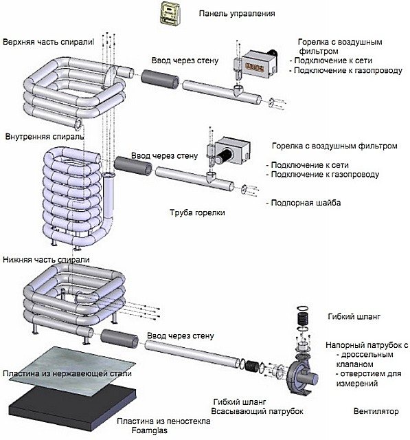 Ve banyo gaz sobaları tamamen sıradışı bir tasarıma sahiptir. Havanın pompalandığı ve gaz yanma ürünlerinin çıkarıldığı, özel olarak düzenlenmiş, spiral sargılı alaşımlı çelik boru hatlarıdır.