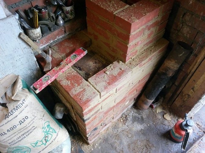 - Daha sonra bacayı metal olanla birleştirdiğimiz dörde koyarız. Boru kesinlikle dikey olmalı ve yana doğru bükülmemelidir. Daha fazla stabilite için üç sıra tuğla ile kaplanmalıdır.