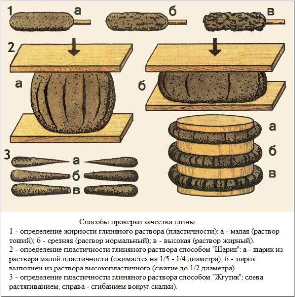 - Kilden (0,5 l) ve az miktarda sudan yoğun bir hamur hazırlamanız gerekir. Kil ellerinize yapışmaya başlamalıdır. Bundan sonra, elde edilen kütleden, biri bir krep şeklinde düzleştirilmiş (100 mm çapında) 2 top (50 mm çapında) kalıplamanız ve 3 gün kurumaya bırakmanız gerekir. Numuneler çatlamışsa, bu nedenle kil çok yağlı ise üzerine kum dökülür. Çatlama görünmezse ve bir metre yükseklikten düşmenin bir sonucu olarak, küresel topak bölünmez, o zaman böyle bir kütleden bir çözüm yapılır. Topun yüzeyinin çatlamaması, ancak düşme sonucu kırılması durumunda, orijinaline daha yağlı kil eklemeniz gerekir. Küçük porsiyonlar halinde katkı maddeleri eklenir ve bitmiş malzeme, bir sonraki kil veya kum uygulamasından sonra, gerekli özellikler elde edilene kadar benzer testlerle tekrar kontrol edilir.