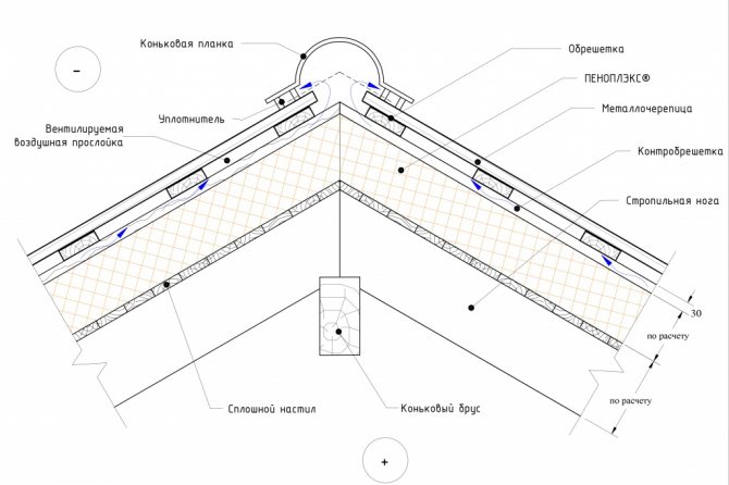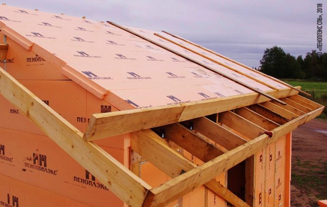 İzolasyon konturunun arkasına, belirtilen çatı eğimini sağlamak için ek bindirme kirişleri monte edilir. Çatı kaplamasının üstüne, merteklere ve çıtalara mekanik olarak sabitlenen bir üçgen profil yerleştirilir.