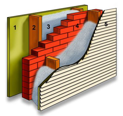 Във всеки случай, профилите за следващите стенни панели трябва първо да бъдат прикрепени към стените, а след това изолацията да бъде приложена по избраната суха или мокра техника. Между другото, за разлика от полагането, сухото пръскане ви позволява да приложите топлоизолация под вече готови панели през отворите, оставени за тези цели.