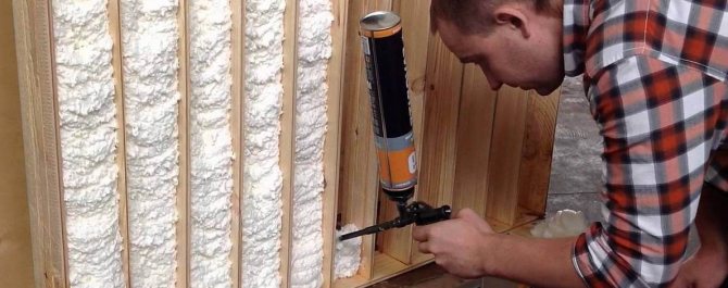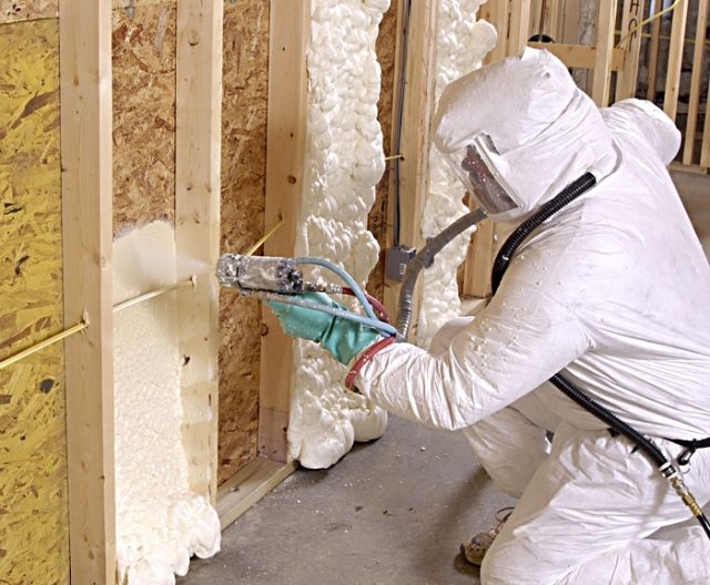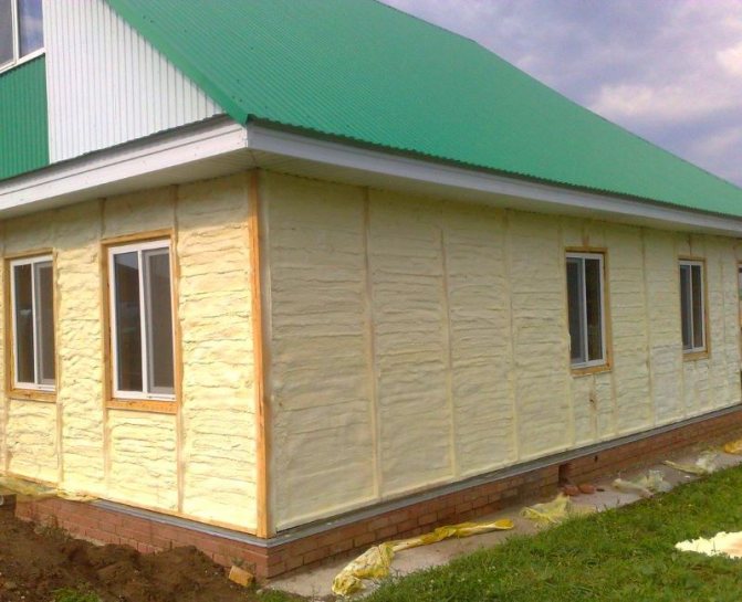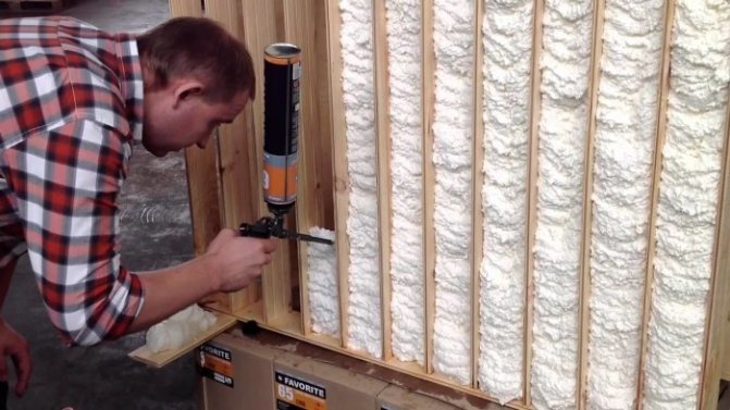 За самоизолация на къща с пяна е необходим защитен костюм. Пяната обикновено се пръска от цилиндър по цялата повърхност на фасадата, използва се за запълване на кухините между стените, гредите и гредите.
