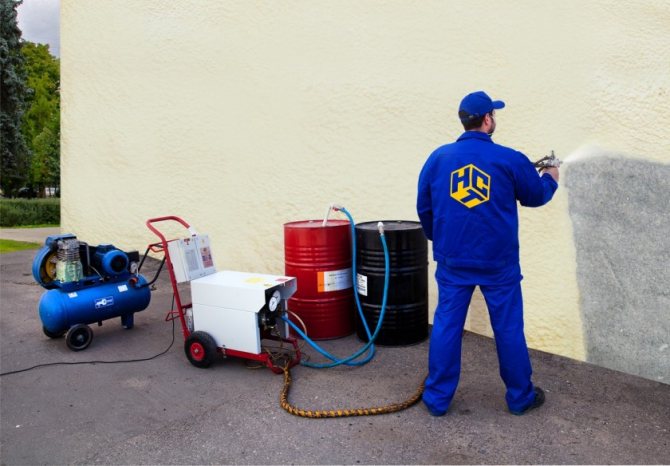 Комплект оборудване за пръскане доста обемно и скъпо, така че е непрактично да го купувате за самоизолация на собствените си стени. Би било много по-евтино и по-разумно да наемете екип от оборудвани майстори.