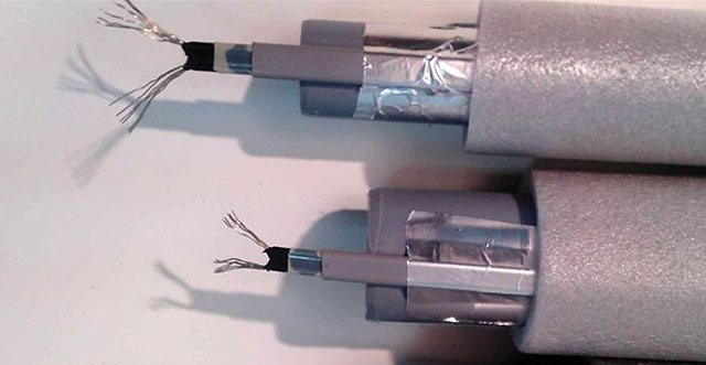 - В топлинната тръба се вкарва кабел, след което от едната му страна се отстраняват 5 см от горния слой и 1 см от алуминий. Излизащите проводници се почистват от изолационния слой и се разделят.