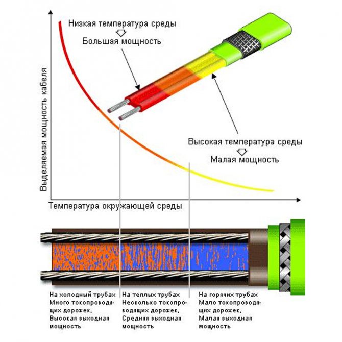 При определена температура на нагревателния проводник се постига равновесие между отделената топлина и консумираната електрическа енергия. По този начин се постига процес на саморегулация: един и същ кабел излъчва различни количества топлинна енергия в зависимост от климатичните условия... В този случай силата на нагряване в различните секции на тръбата може да се различава.