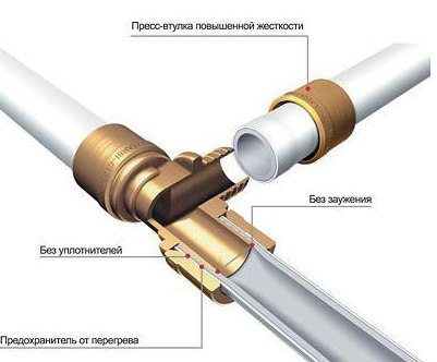 След това се хвърля специален съединител и самият фитинг с О-пръстени се вкарва в тръбата. Отгоре се извършва кримпване с подготвени клещи. По този начин е възможно да се стикира пластмасовите елементи.