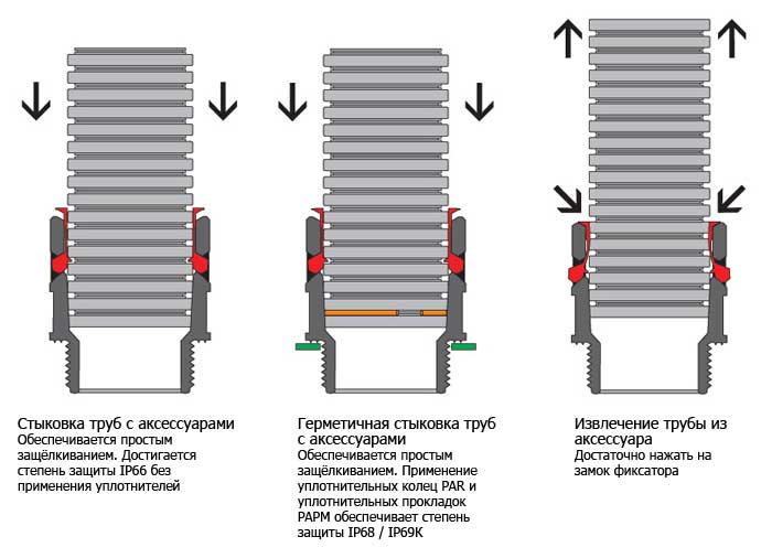 Представеният метод е приложим главно за канализационни системи, тъй като те не създават налягане. В краищата на използваните елементи има специални връзки за пластмасови тръби - гнезда. С тяхна помощ се прави самата фиксация.