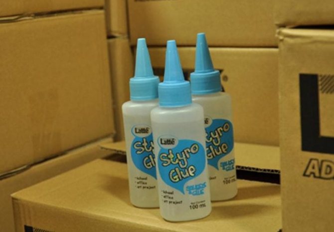 - Специално лепило за стиропор за слепване.Можете да намерите такъв в специализирани магазини за хардуер на доста ниска цена при конфигурацията Styroglue, но той е доста рядък на рафтовете, което е трудността при придобиването му.