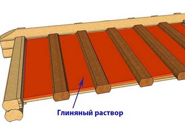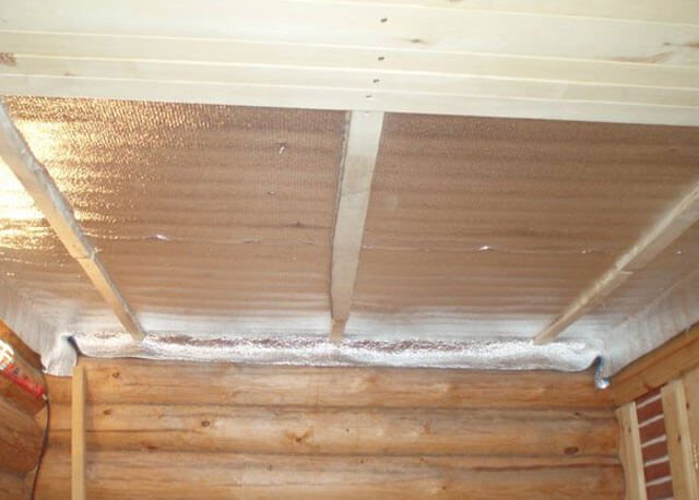 - Таванът на дървените трупи е предварително обвит с дъски с дебелина 6 см. Върху решетката е фиксиран фолио от 100 микрона или дебел картон, обработен с ленено масло.