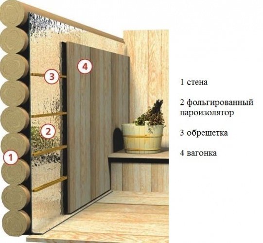 Схемата на пароизолация на стените на парната баня практически не се различава от "пай" на тавана.Цялата разлика е в дебелината на топлоизолационния слой (за тавана той е два пъти по-голям). Също така се препоръчва да се постави фолио или мембрана по стените в парната баня (не забравяйте да осигурите неговото "влизане" към тавана и пода).