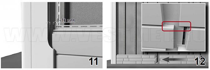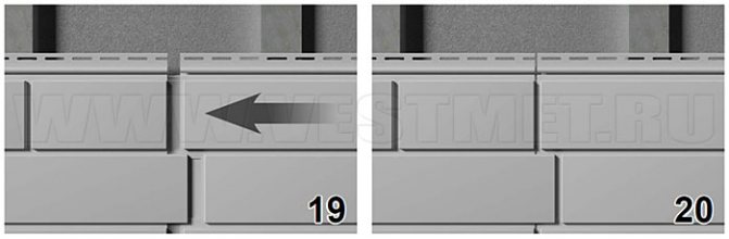 - Монтажът на предните панели се извършва отляво надясно, в зависимост от местоположението на елементите с жлеб и жлеб. Стените са завършени на свой ред, за да се избегне проникването на влага до края на работата. Всеки следващ ред се монтира с изместване наполовина или една трета от размера на елементите. Това допринася за по-добро прилягане и естествен вид.