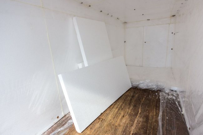 - Стените, таванът и пода са завършени с дебели листове полистирол с помощта на течни пирони.