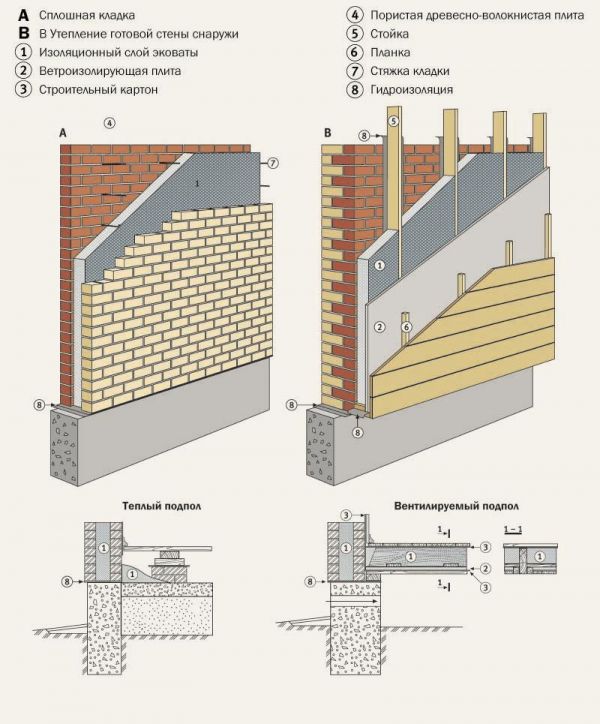 | За да се избегне образуването на конденз под обшивката, между нея и основната стена се прави празнина с изолация. Също така, празнините са оставени в долната част, между тухлите на първия ред. Възможно е да се поставят пластмасови тръби между шевовете на няколко места по целия ред. Ако сте изправени пред неотопляемо помещение с тухла (навес, гараж и други стопански постройки), тогава е възможна опция без изолация и въздушна междина. | Вентилирана фасадна зидария. |