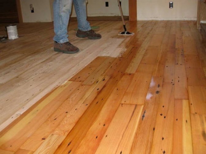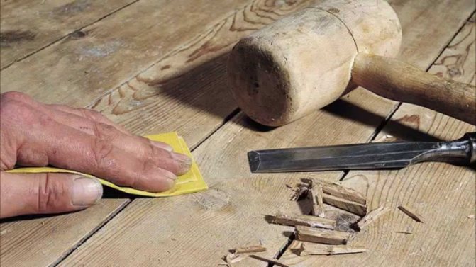 - Стъпка 2. Сега с острие на брадва отрежете стърчащите стари петна от боя върху дъските на пода и леко шлайфайте целия под със среднозърнести шкурки.