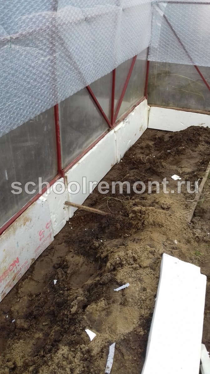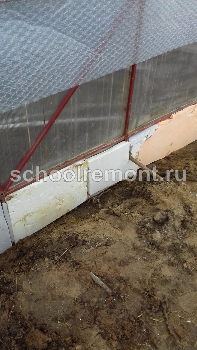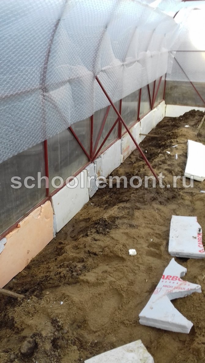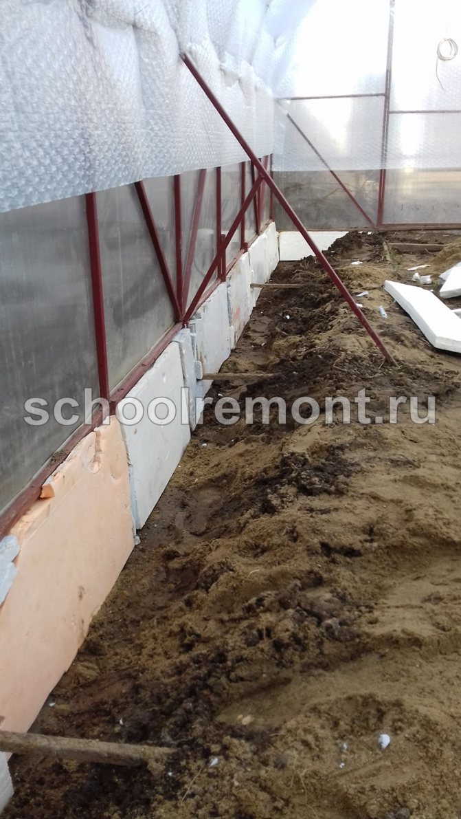 Ако конструкцията е инсталирана директно на земята, първо, почвата е изолирана в оранжерията. За тази цел от топлоизолационен материал е изграден защитен цокъл с височина 50-60 см. В работата могат да се използват плочи от газобетон, дървен бетон, пенобетон или експандиран глинен бетон. Самата основа е заровена частично в земята, за да се увеличи стабилността. Като алтернатива на новата основа, изолацията може да се извърши чрез повдигане на самите легла над нивото на земята на ниво 50 - 70 cm.