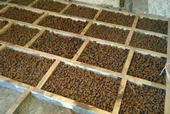 Що се отнася до експандираната глина, тя просто се разпръсква по повърхността на подовата настилка, след като е запълнила ограничителните елементи по периметъра на последната. Това могат да бъдат едни и същи ламели, подредени вертикално в три реда. Дебелината на разширения глинен слой от 150 мм е повече от достатъчна.
