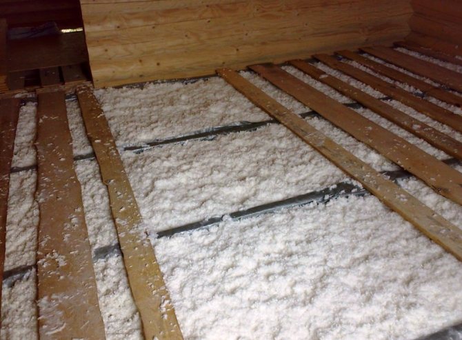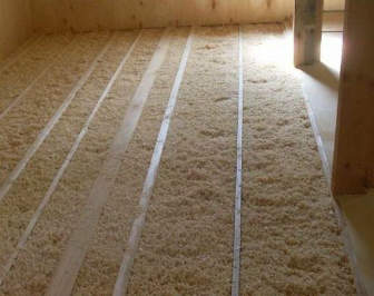 Естеството и първите етапи на тези работи са същите, както в случая на дървени стърготини. След подготовката на повърхността се полага памучна вата, пукнатини и дупки се издухват (големите трябва да се уплътняват) и след това всичко това се покрива с филм. Можете да поставите дъски отгоре или да направите замазка.