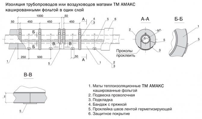 Когато изолирате тръбопроводи с продукти в метални мрежести облицовки, надлъжните шевове трябва да бъдат зашити с тел с диаметър 0,8 mm. За тръби с диаметър над 600 mm се зашиват и напречни шевове. Прошитите с минерална вата по време на монтажа се уплътняват и достигат следната плътност (съгласно GOST в проекта), kg / m; постелки от марка 100-100 / 132; марки 125-125 / 162.