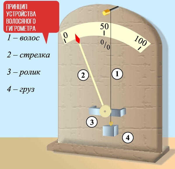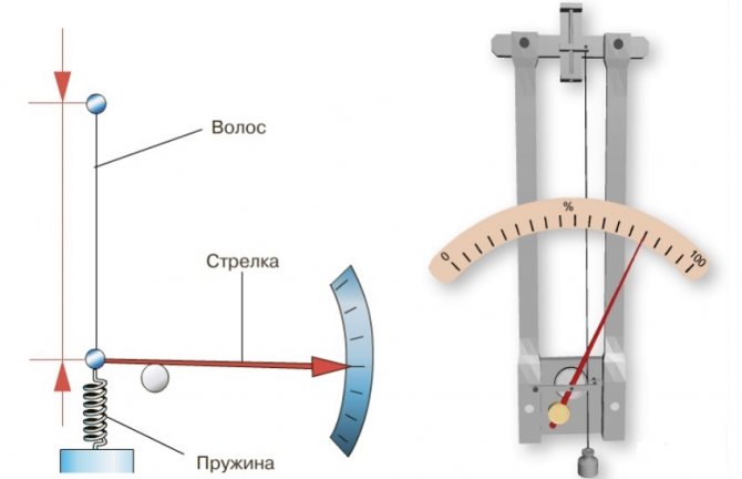 Достатъчно е само да погледнете стрелката, под която има скала с деления в 1%. Принципът на действие се основава на промяна в линейните размери на обектите, в зависимост от тяхното насищане с влага. Като такъв артикул се използва обикновена коса без мазнини. Оттук идва и името на устройството "коса".