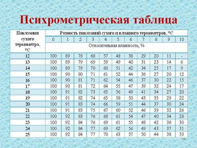 Определянето на влажността на въздуха с помощта на психрометър (от гръцки - студ) не е трудно. Работата на устройството се основава на факта, че наличието на влага понижава температурата. Панелът има 2 термометра и психрометрична маса. Първият термометър е сух, вторият е мокър. За да измерите, трябва да намерите разликата в показанията на температурата. В таблицата вертикално е посочена температурата на въздуха, измерена от термометъра със суха крушка, хоризонтално разликата в показанията. Пресичането на тези две линии показва относителната влажност като процент.
