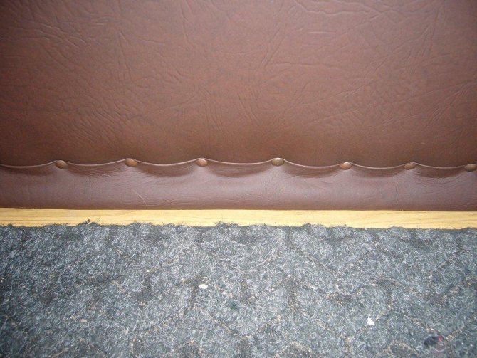 - Сега пристъпваме към подготовката на ролките, които са необходими за запълване на пространството вътре в кутията. Ако се отвори навън, тогава е необходимо да се маркират и изрежат 3 ленти от изкуствена кожа с ширина 140 mm, а дължината на едната лента трябва да съвпада с дължината на вратата, а за другите две, равна на ширината на вратата. Закрепете с малки пирони по периметъра на отвора, отстъпвайки назад 1,5 см. Само тапицерията остава на страната, на която са разположени пантите. За врата, която се отваря навътре, се изрязват 4 ленти: 2 дълги и 2 къси - и се заковават от всички страни.